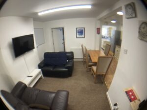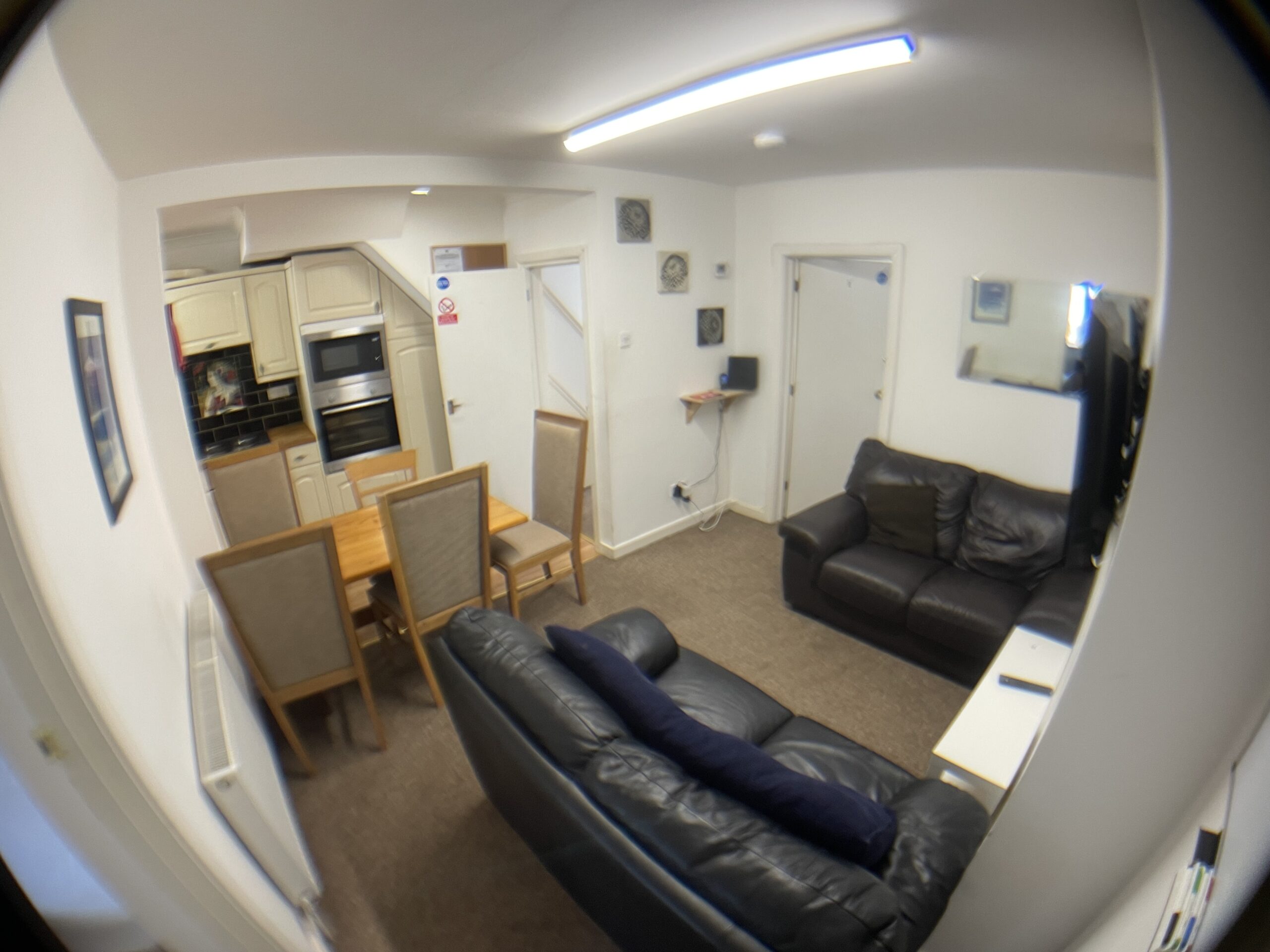 - The lounge includes sofas and a dining table and chairs and a modern wide screen TV
